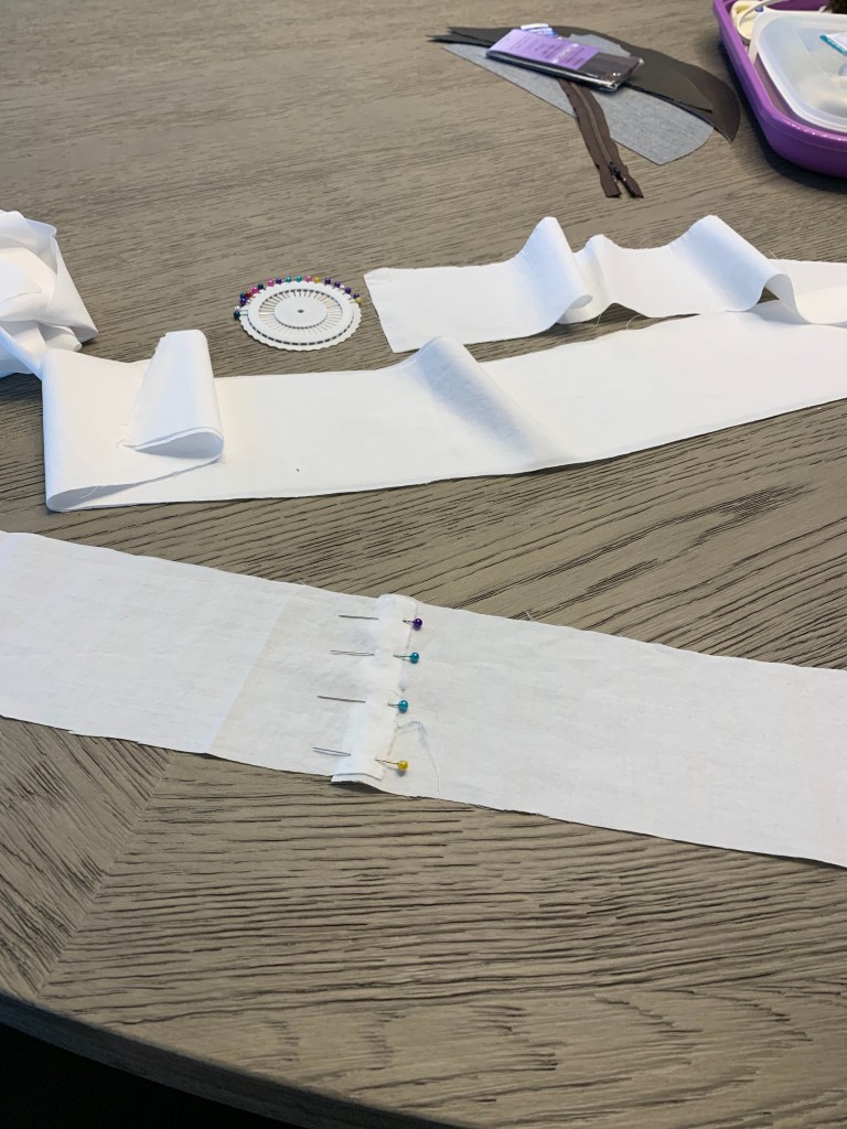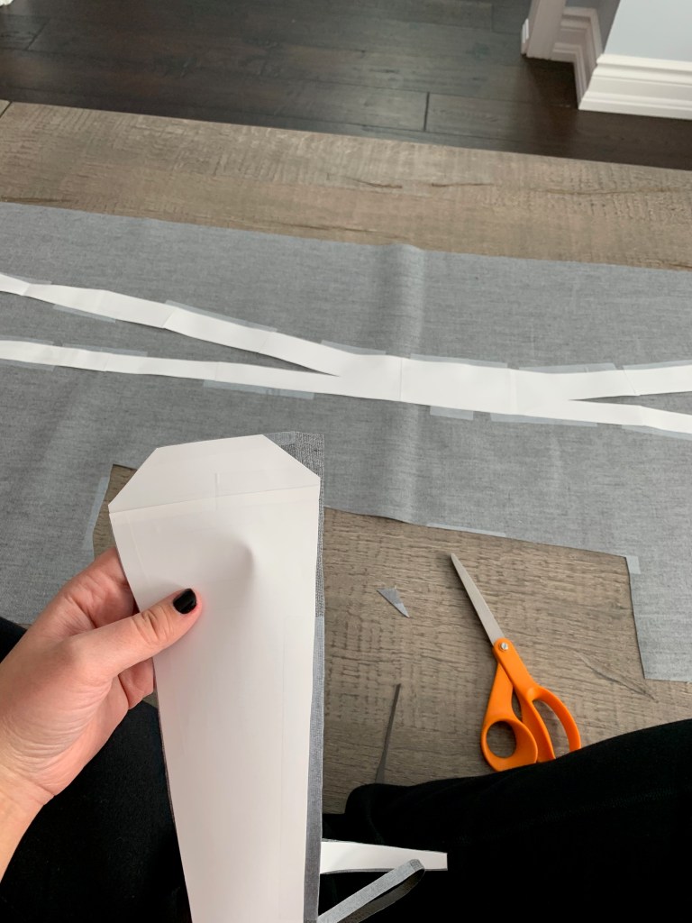 Rather than buying lengths of fabric, I bought two infinity scarves from a fast-fashion store, cut them in half so that they were each one long rectangle, then cut those two rectangles in half length-wise, so that I was left with 4 long grey rectangles.