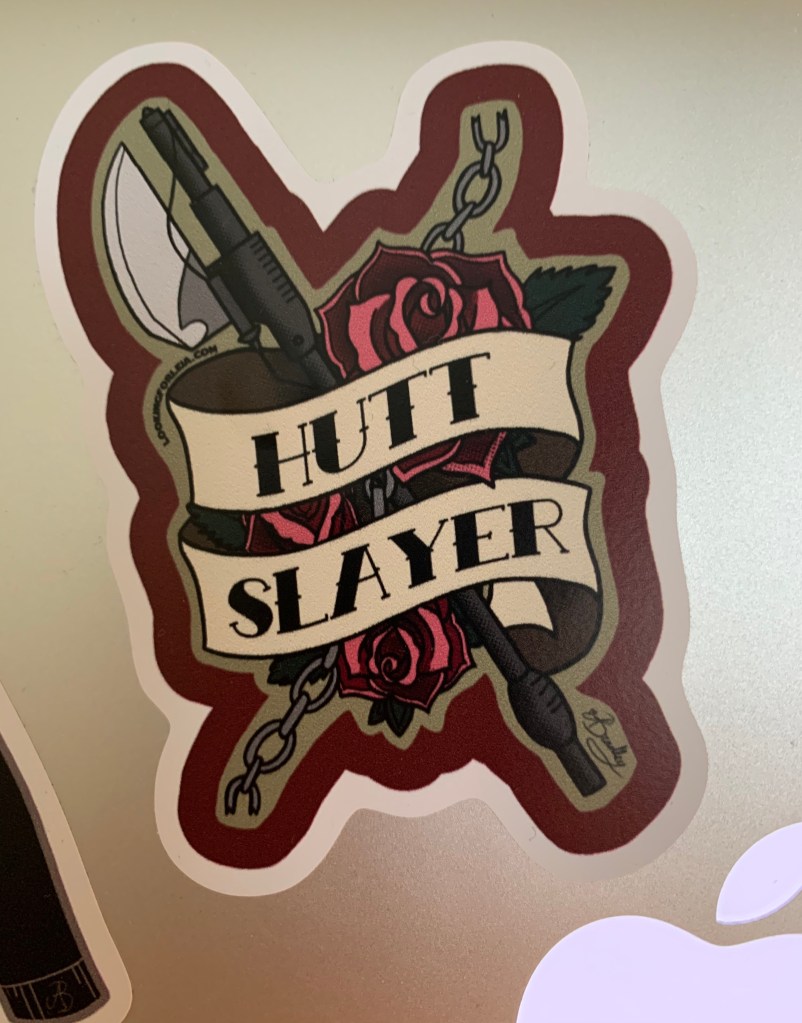 There are a lot of reasons I love this so much. I love it because this idea of Leia killing the being who dared hold her captive is how Carrie Fisher framed that plot point. I love it because it injects agency into a thing that has long been fetishized for the wrong reasons. I love that it has taken on a life of its own outside of the book. Costuming groups refer to this outfit as “Huttslayer Leia”. I’ve got this badass sticker on my laptop, created as part of the promotional campaign for the “Looking for Leia” docuseries (art by @miss.lys on Instagram):