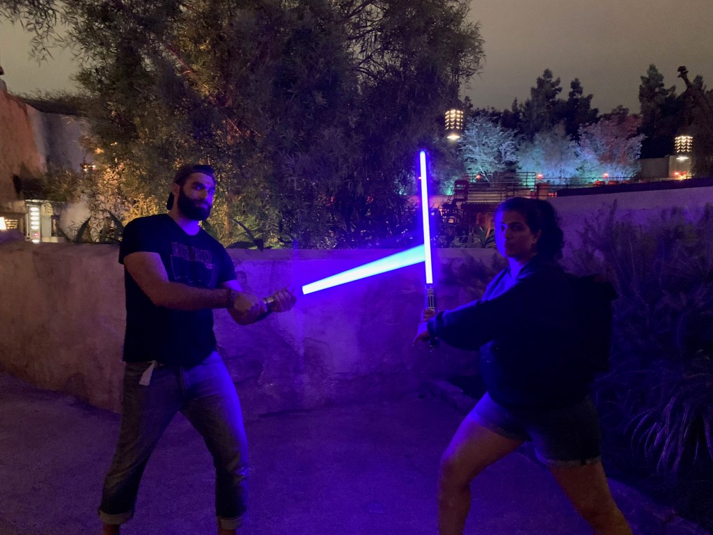 But because we both like options, we wanted alternate kyber crystals. Unfortunately they were all sold out. I knew I would be going back the next week during D23 weekend, so I said I would check. I heard a rumour that they did in fact have kyber crystals, but would only sell you one if you bought a holocron too. No way was I dropping $50 per person, so I slipped into Dok Ondar’s that afternoon with every intention of covertly asking the Cast Member to make an exception. I walk up to him and whisper “so I hear you have kyber crystals?” as if I’m conducting the shadiest deal in the world. He matches my tone, looks around to make sure no one is watching, then pulls one crystal of each colour out of his pocket and mumbles instructions on how to get them (at the cash register). Just wanted to shout out this CM, whose name I’ve sadly forgotten, for playing along with a game I didn’t even realize I was playing.