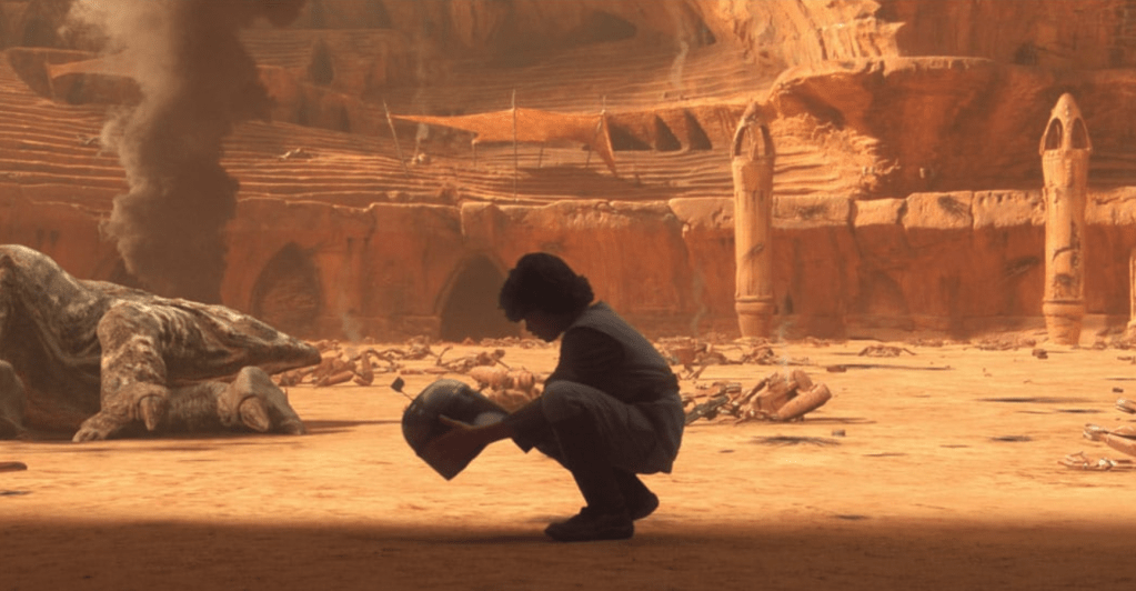 I am, as some of you know, a new Boba Fett stan. What can I say, I walked into The Mandalorian chapter 14 a cynic and walked out a changed woman. Boba doesn’t do much in Attack of the Clones, granted. He’s mostly there so we, the audience, get some background on the bounty hunter we know later, and to give some stakes to Jango Fett’s story arc. The part of Boba’s story that really sticks with us, is this one really great, absolutely heartbreaking shot towards the end of the film: